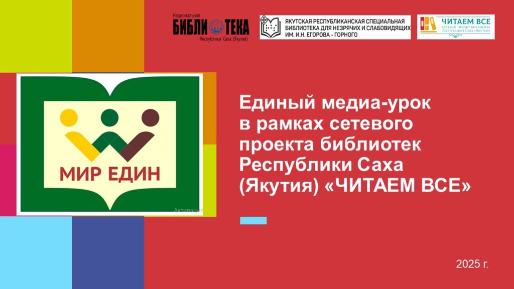 24 октября ГКУ РС(Я) «Якутская республиканская специальная библиотека для незрячих и слабовидящих им. И.Н. Егорова — Горного» при поддержке Министерства культуры и духовного развития Республики Саха (Якутия) запускает ежегодный единый медиа-урок «МИР ЕДИН» в рамках сетевого проекта «ЧИТАЕМ ВСЕ» к Международному месячнику «БЕЛАЯ ТРОСТЬ».